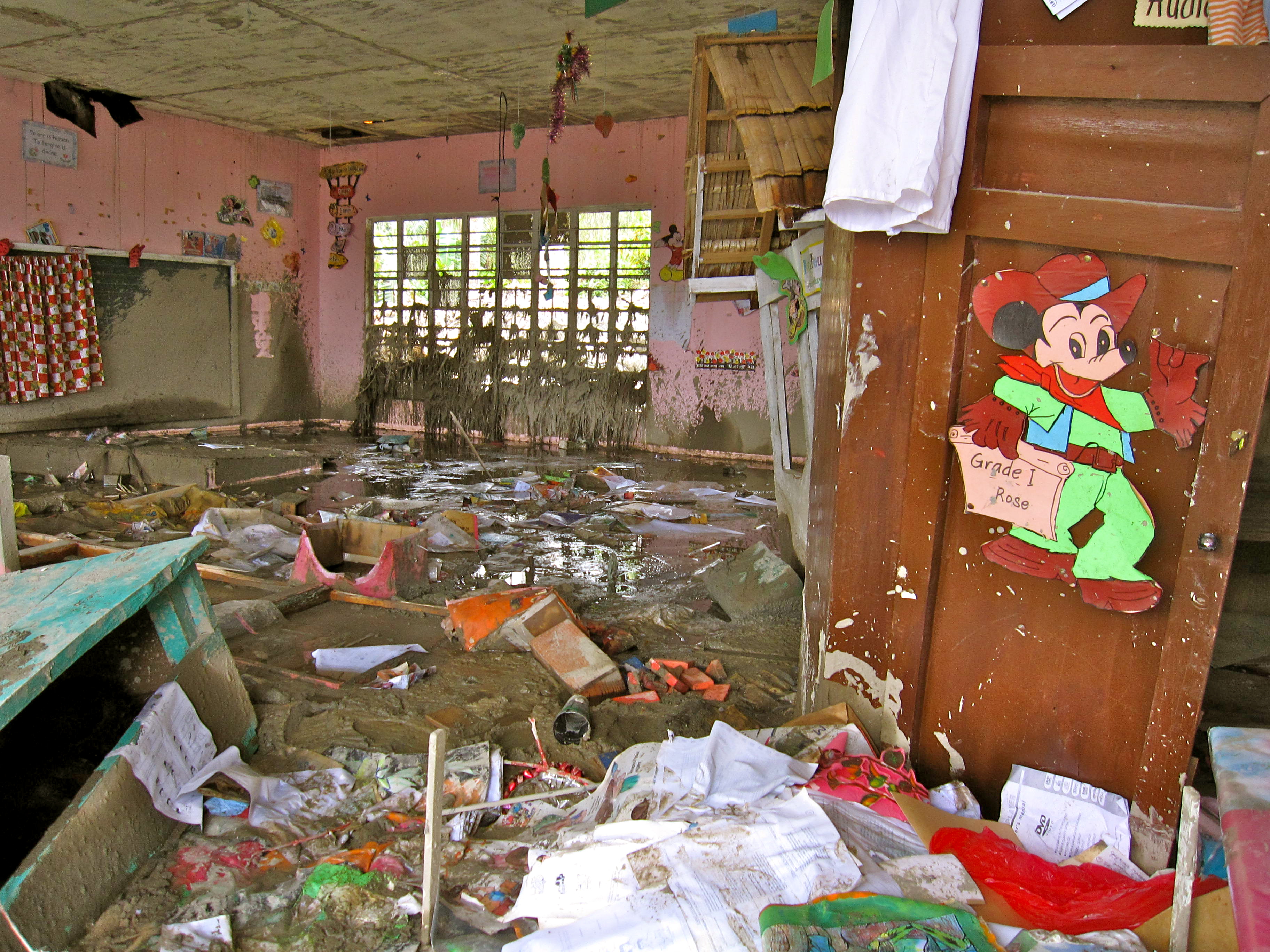Only part of school remains in the town of Andap, Compostela Valley, Davao, Southern Philippines. Typhoon Bopha struck on 4 December 2012 causing landslides and floods which changed course of the river ravaging homes, and this elementary school in under four-hours. Out of the 6.1 million affected by Typhoon Pablo, over 2.6 million are children. UNICEF has been on the ground since the beginning bringing help, providing water, sanitation, health, psycho-social services, child protection and education to the children and mothers of the region.