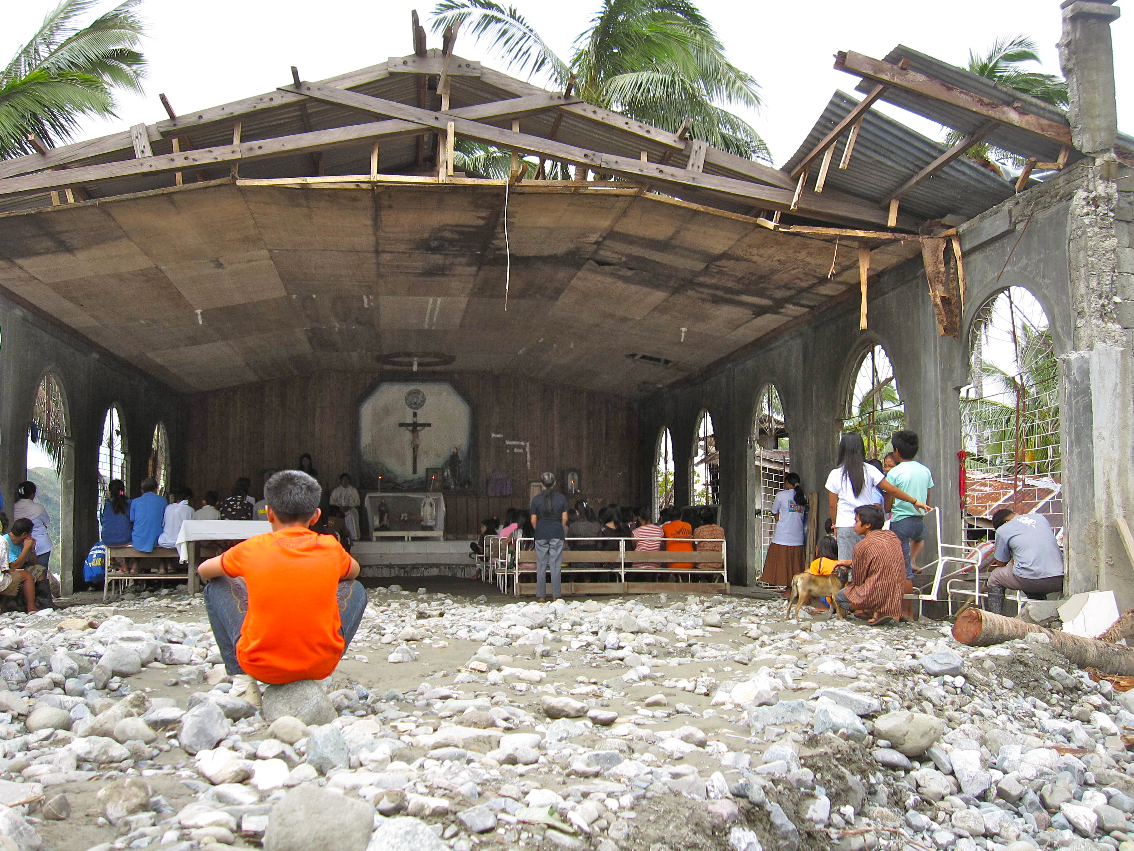 The Catholic Chapel now neighbours what is being described as ‘ground zero’ – a newly created riverbed of giant boulders, rock and congealed mud that was created by a massive landslide in the path of the 185-kmp winds.